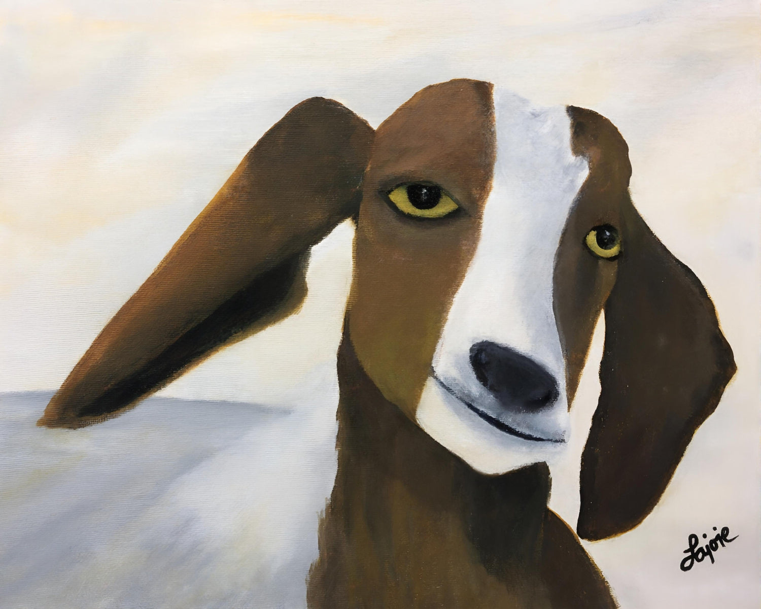 Meet Mouse—a goat with a personality as unforgettable as her name. Her golden eyes, sly smile, and windswept ears suggest she's seen it all and isn't afraid to tell you what she thinks. This portrait was inspired by a real-life encounter at a farm, where I met this delightful creature in person.