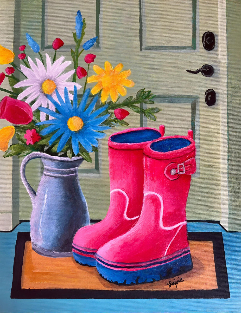 A pair of bright pink boots stands ready by the door, resting on a welcoming mat beside a rustic pitcher of cheerful wildflowers. The soft tones of the doorway hint at home’s warmth, while the vivid blooms and sturdy footwear celebrate resilience and joy in everyday moments. This piece evokes the comfort of returning home after a long day—no matter the weather. |